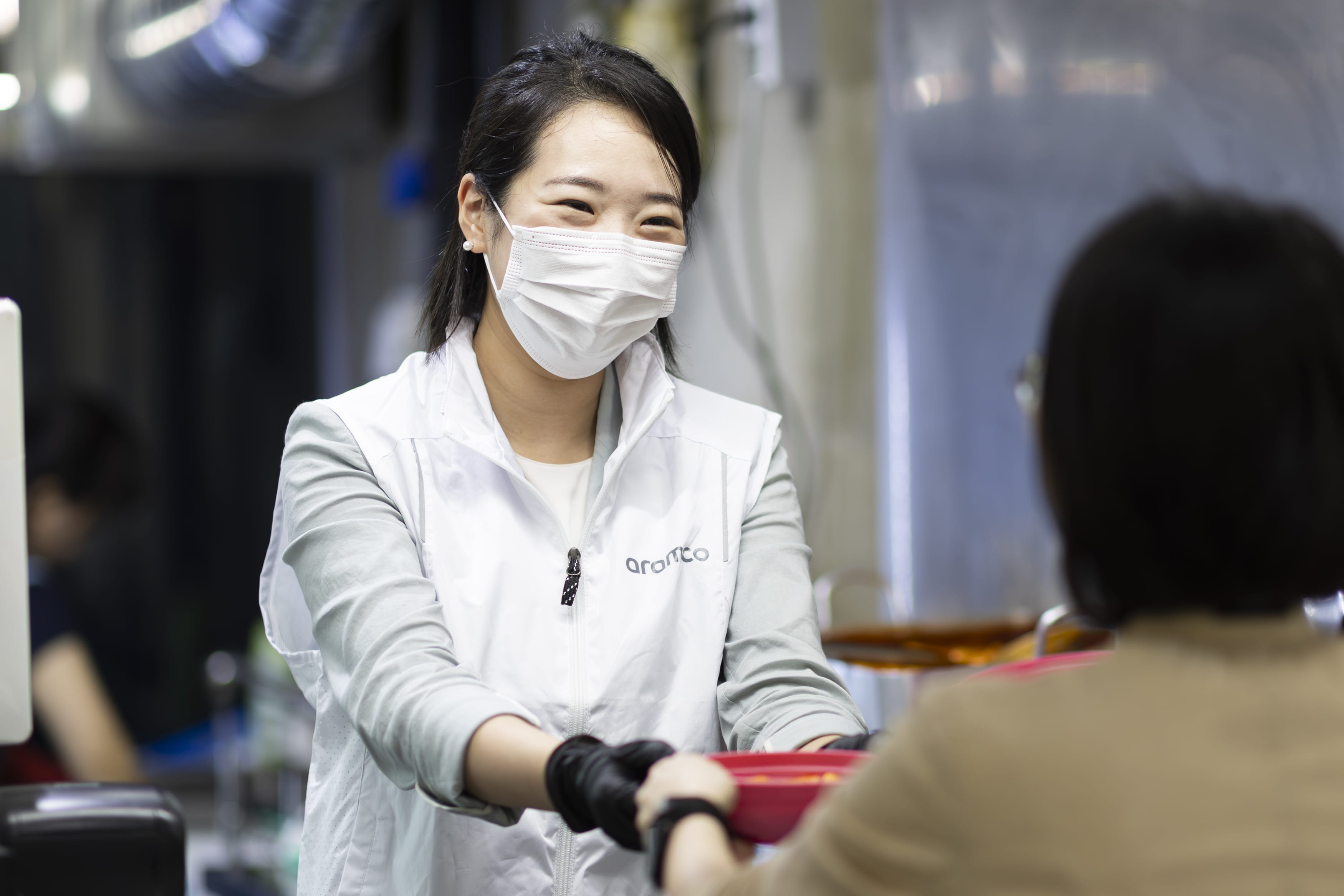 Aramco Korea volunteers serving snacks and food with the multi-use plastic food trays at Gocheok Sky Dome